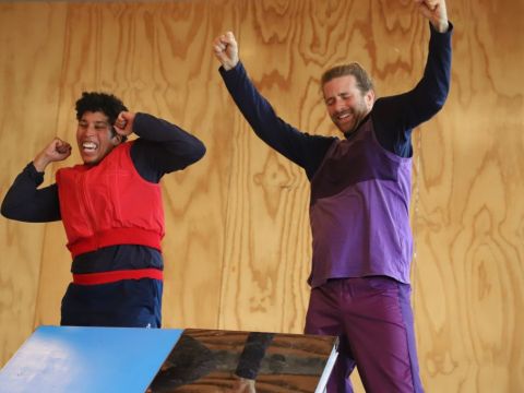Opzwepende muziek, dans, live zang en een grote glijbaan op het podium. Twee performers spelen erop los. Speel je mee?